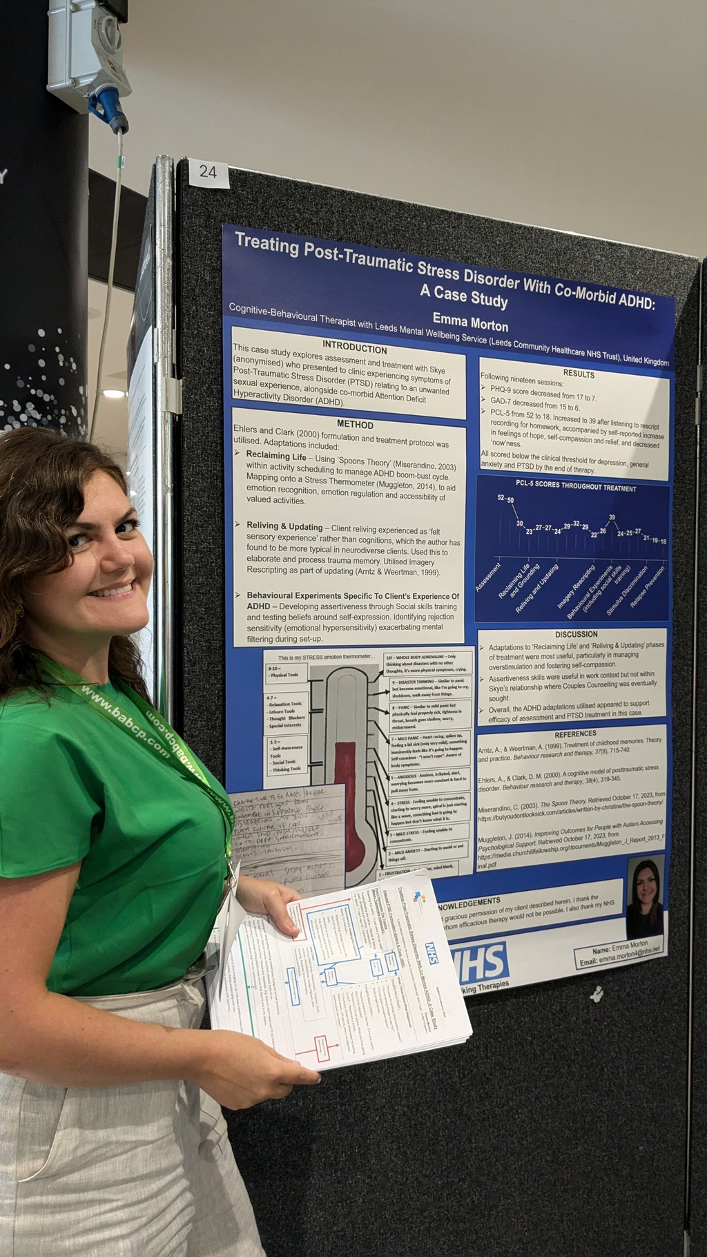 2022 to now: I had an opportunity in 2022 to train in my NHS placement toward a Post Graduate Diploma in High Intensity Psychological Interventions. This is where I can officially call myself a ‘Cognitive Behavioural Psychotherapist’. Therapists trained to this level grow their skills to support all of the people that Low Intensity Practitioners can, though these clients may be experiencing more severe forms of depression and anxiety conditions. I also received training to work with other conditions such as Social Phobias, Health Anxiety, Post Traumatic Stress Disorder, Emetophobia (Fear Of Vomit), and Body Dysmorphic Disorder. Upon completing my training, I decided to set up my private practice ‘CBT by Emma’, where I can take all of my skills from the past few years and use them to support people along their mental health journey! And that’s where you can find me today!